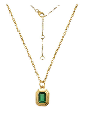 The Ames emerald amulet necklace features a golden amulet set with a sparkling cz emerald baguette