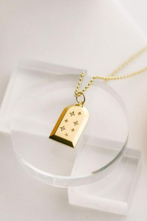 The Ferris necklace features a golden arch speckled with tiny CZ diamonds and starbursts