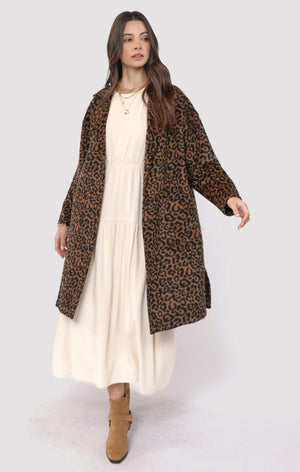 This leopard print coat in brown and black features a 3/4 sleeve design, an open front, and a midi length for stylish coverage. It includes deep front pockets and a relaxed drop shoulder silhouette, crafted entirely from polyester for comfortable wear.