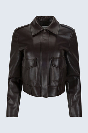 A modern update to the classic leather jacket, Bex is cut with a cropped, shrunken fit that delivers edge without bulk. Designed with a sharp collar, front flap pockets, and sleek lines, it’s crafted from buttery soft alternative leather in French Roast, a deep brown with rich sheen, for a finish that feels both polished and cool.