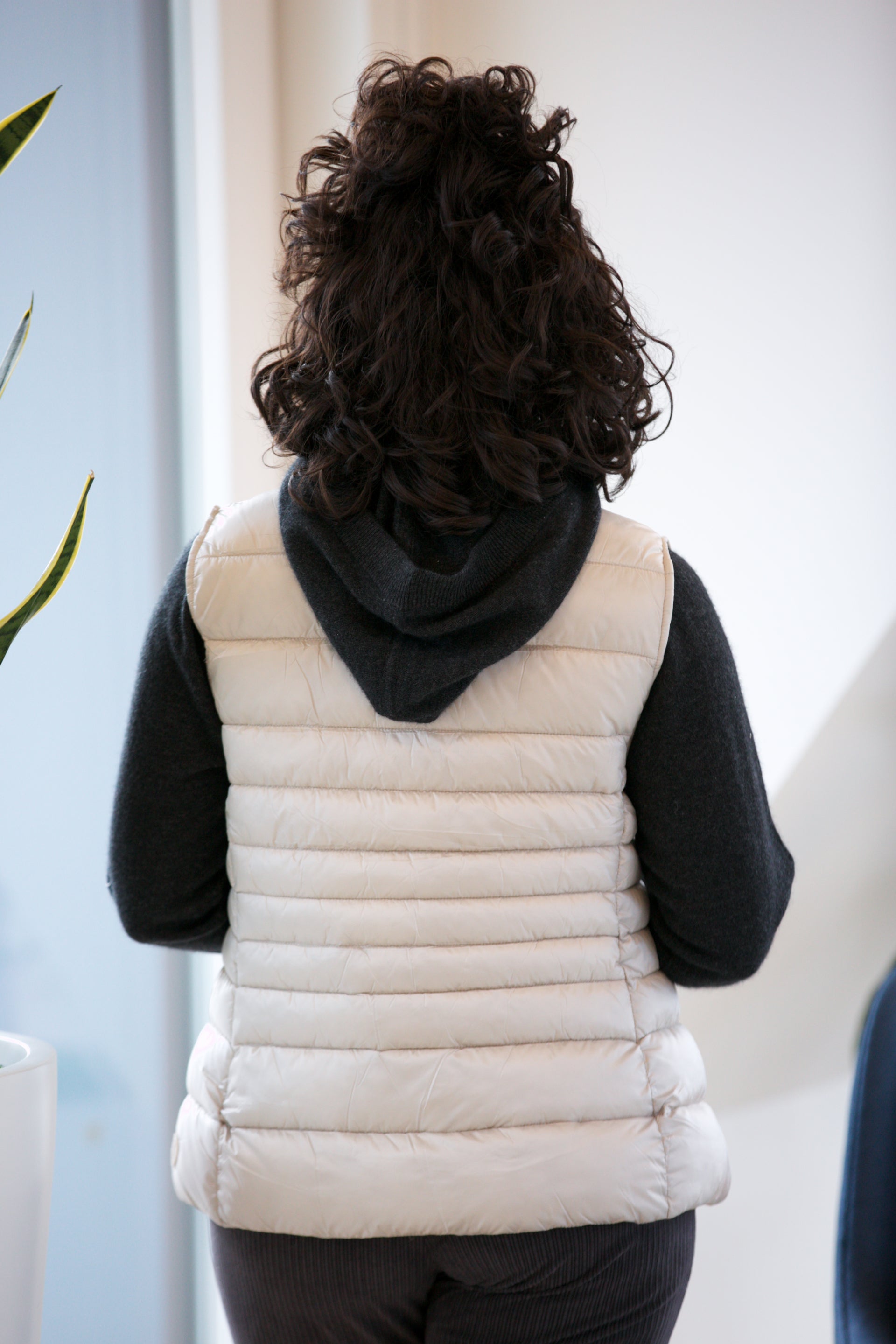 Whether you wear it on its own or underneath a thicker layer, the Lynn puffer vest is your go-to piece this season. It features a standing collar, a central double slider zip, two side pockets with zips and with its animal-free padding, water repellent finishing, and iridescent shine, it’s a style that you can take from day to night, from the office to the outdoors.