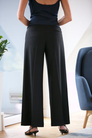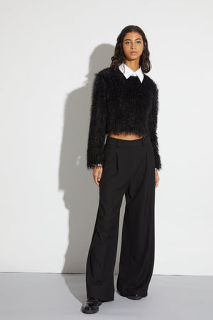 New in: the Tiffany black mid-waisted wide leg trouser in Saint Art's signature soft suiting. Expand your work to your weekend wardrobe with this gently tailored mid to high-rise bottom.