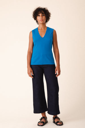 The newest addition to our thick organic cotton rib series. The sleeveless Soft V is the essence of simplicity and femininity. Ideally proportioned for a lithe feeling, it’s not too low cut nor too long. Fitted armholes and sleeves fit like a bodysuit while the flattering stretch rib sculpts the body. A clean layer in plant-based fibers that is suitable for the office or a day at the beach. Whether worn layered or alone, you will find yourself reaching for this perfect basic again and again.