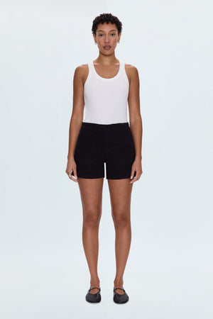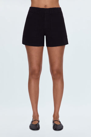 Sharpest tool in the shed. High rise short with a relaxed fit and medium length, crafted from a lightweight stretch fabrication and adorned with utility inspired design notes. Noir is a clean black hue with endless pairing potential.