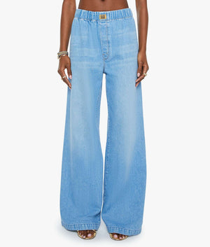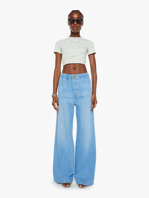 Wide leg jeans from SNACKS!, a collection of unconstrained silhouettes leaning into exaggerated shapes and extreme proportions. Experimental and non-era specific. For everyone, or not. These high-rise jeans have an elastic waistband, loose, wide leg and a long 31-inch inseam with a clean hem. Made from a recycled cotton blend, All You Can Eat is a light-blue with a pretzel-detailed button and candy-inspired interior rivets. Would you like a treat?