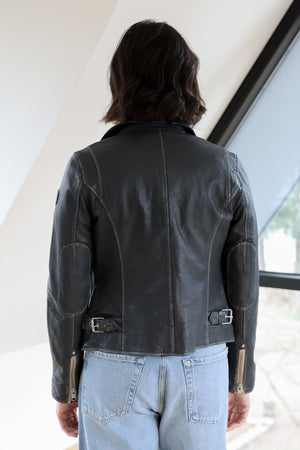 Made of 100% lambskin, the seams are polished and the zippers are contrasted to give a distressed feel. This jacket is vegetable tanned and ethically produced for the socially conscious!