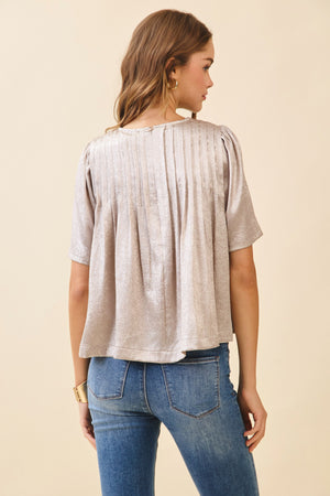 A metallic top featuring a round neckline and short sleeves.