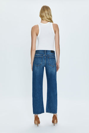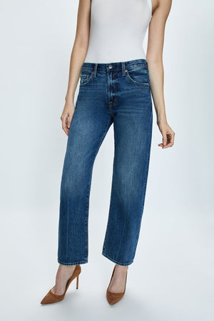 Mid-rise, with a straight leg that bows at the knees for an arched, barrel leg silhouette. Ankle length crop with a clean hem. Artisan is an ultra cool dark wash with gentle fading around the knees and thighs.