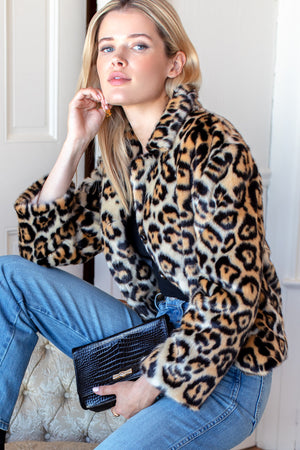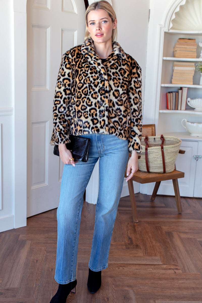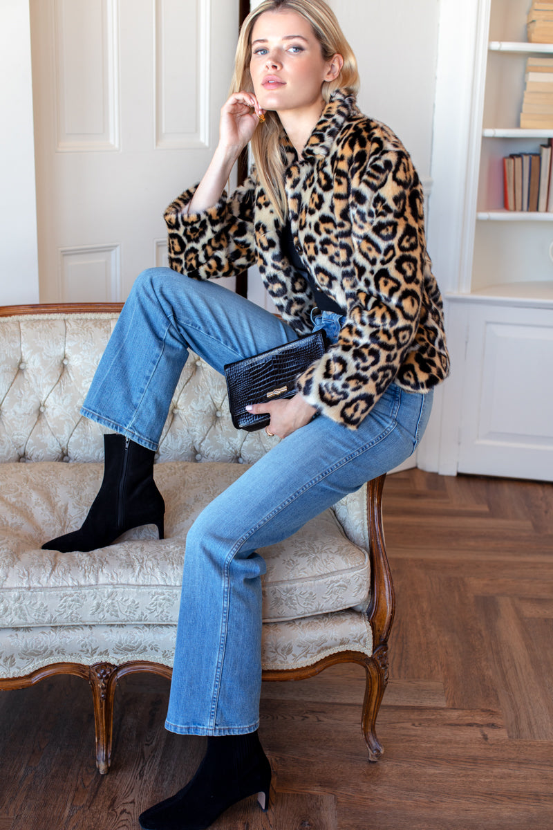 A throwback leopard moment for your timeless modern wardrobe. Easy, fun dressing w/ denim or throw on with your slinky dresses for a standout evening look. Soft vegan leopard for staying cozy & warm all winter.