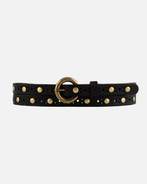 Elevate your style effortlessly with our skinny leather belt Chloe. Adorned with vintage bohemian studs and an antique gold round buckle, it pairs seamlessly with dresses or jeans, adding a captivating touch of sparkle and a distinctive bohemian edge to your outfit.