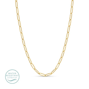 The elongated paperclip links create a bold yet minimalist silhouette that layers beautifully or stands out on its own. Designed to be water resistant, this necklace is perfect for daily wear— maintaining its shine through everyday activities.