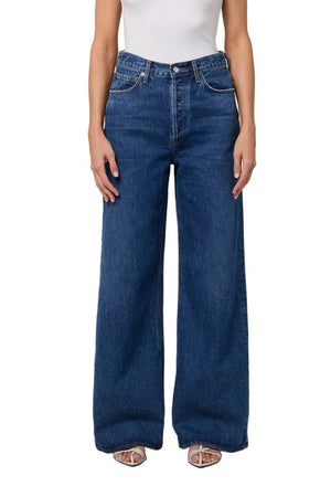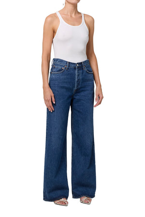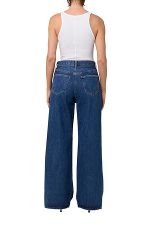 Featuring a waist accentuating high-rise, a relaxed cut through the hips and a wide leg. Style it with a sleek tee or ribbed knit. This fit is true to size.