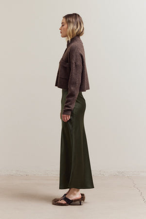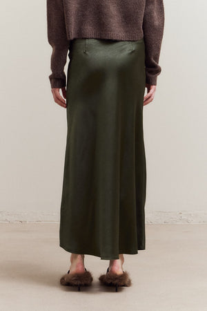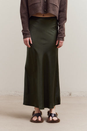 A fluid satin skirt designed to move with subtle grace. The Suvi Skirt features a high-rise waist and a gentle mermaid silhouette that skims the hips before softly flaring at the hem. Crafted from a smooth, lightweight satin with a touch of sheen, it brings understated elegance to both casual and elevated looks.