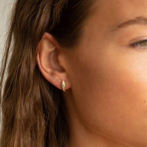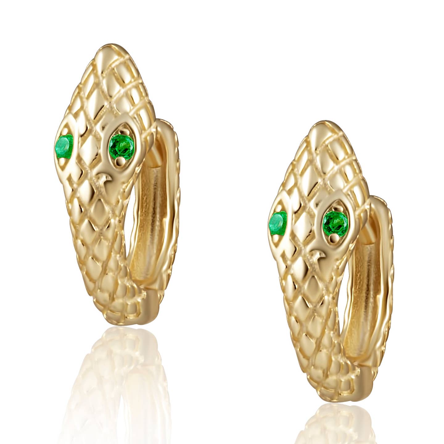 Show off your daring side with Sahira's Mini Snake Huggies featuring emerald green cz stones and uniquely imprinted designs.