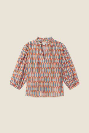 The Orly Blouse is a slightly cropped, billowy blouse with straight bottom hem, split v-neckline and buttoned crown collar. Gathered three-quarter length sleeves finished with delicate bindings. Includes our signature back detail with a gathered waist tab. Shown here in Retro Grid and made from cotton voile.