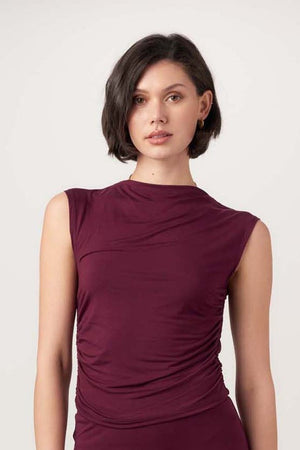The Walk Away Shirred Top is made from a soft, stretchy blend of fabric for a smooth, body-skimming fit. Designed with a high neckline and sleeveless silhouette, it features shirred detailing along the sides that creates flattering shape and texture. Finished with clean edges for a sleek, polished look. Wear it solo or paired with the Walk Away Skirt for the head-to-toe look.