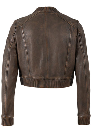 Kamaryn redefines the classic bomber with a cropped cut and rich brown marble wash. Ribbed cuffs and waistband add a secure fit, blending effortless style with everyday comfort.