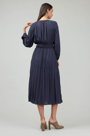 Embody effortless femininity with the NYLAND Marianne Pleated Midi Dress — a long-sleeve silhouette that pairs a flattering V-neck with a swingy, pleated skirt for a look that moves with you.