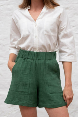 The easiest shorts you'll ever own. These pull-on style, wide leg shorts are endlessly comfortable and perfect all summer long. Fully elasticized waist. Deep carpenter style pockets at front. Made from a slightly crinkled, super soft double gauze cotton. Crafted in partnership with Fair Trade Certified producers in India.