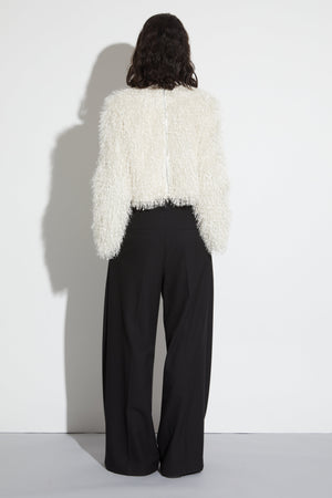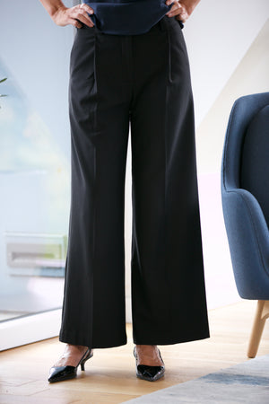 New in: the Tiffany black mid-waisted wide leg trouser in Saint Art's signature soft suiting. Expand your work to your weekend wardrobe with this gently tailored mid to high-rise bottom.