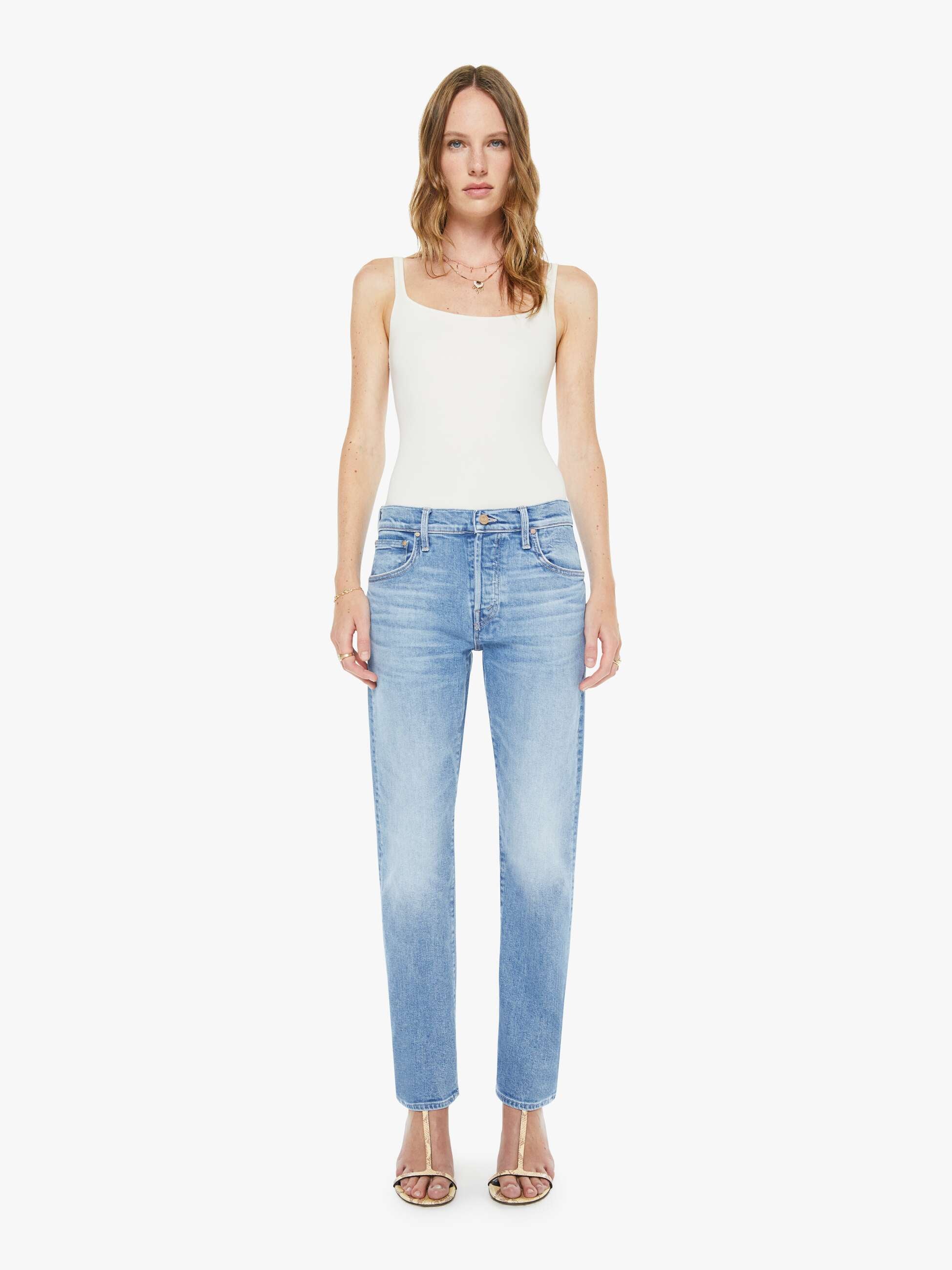 This slim straight-leg was adopted from our men’s line and features a mid rise, button fly, low-set back pockets, a 30-inch inseam and a clean hem. Made from denim with a touch of stretch, Baubles And Trinkets is a light blue with whiskering and fading at the knees.