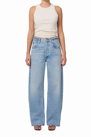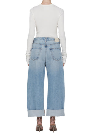 Looks Like: Light vintage indigo with subtle whiskering and soft fading, finished untacked cuff