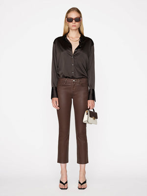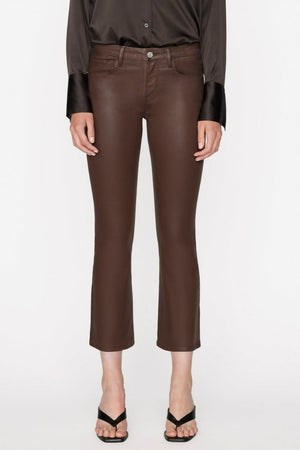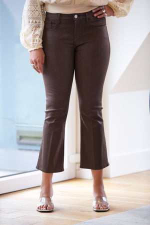 Constructed of coated stretch denim, these cropped boot-cut jeans are cut in a mid-rise. Designed with a comfortable contour waistband that’s form-fitting at the top and tapers out from the knee, offset yours with a ladylike jacket, feminine knit, or frilled blouse.