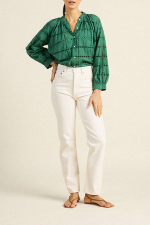 The Mena Blouse is their newest blouse with a buttoned center placket, voluminous sleeves, with a notched collar and raglan armholes. The Mena Blouse excels when paired with jeans, tucked or untucked, for the perfect fit. Shown here in Emerald Eyelet and made from soft cotton.