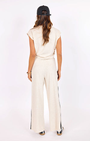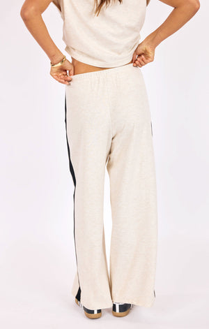 The Metro Knit Pants feature a soft heather oatmeal hue accented by contrasting black side stripes. An elastic waistband and drawstring tie define the rise, with a relaxed wide-leg cut detailing the full-length silhouette.