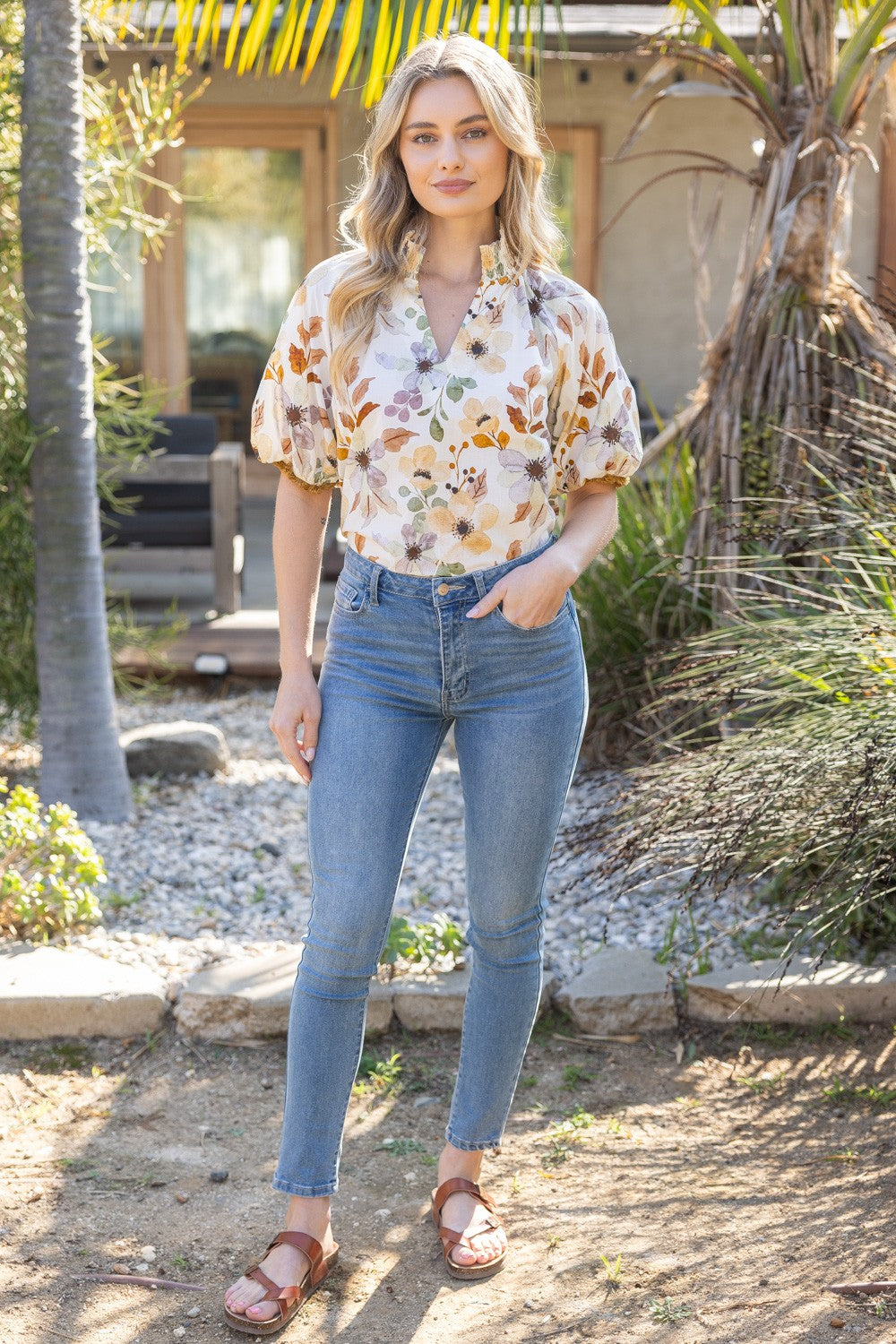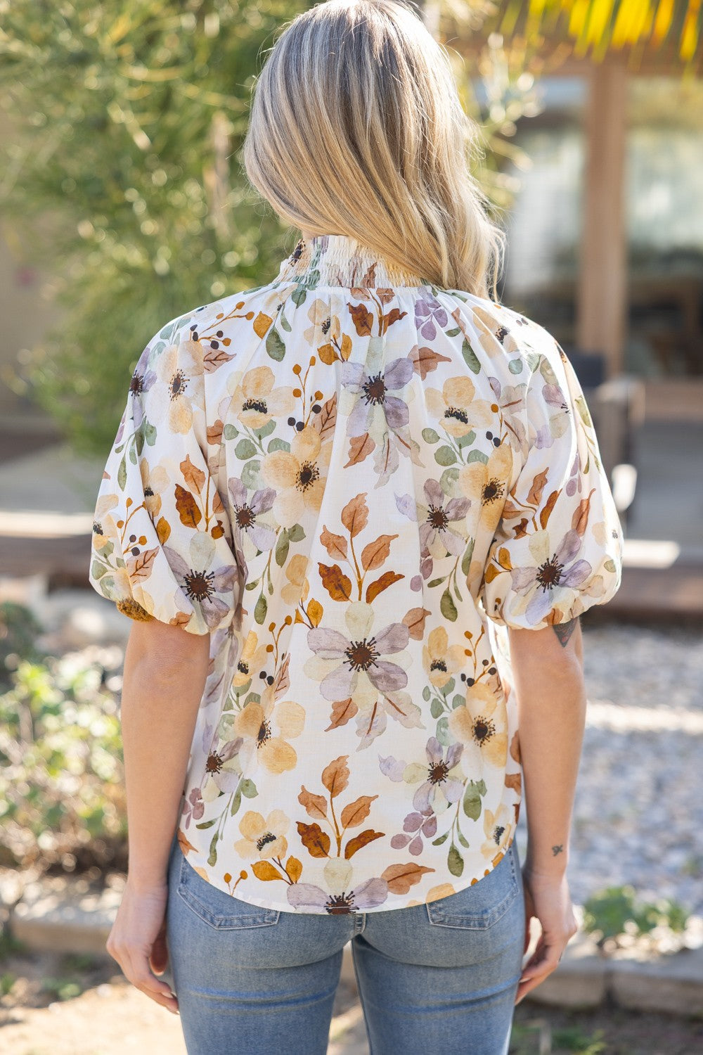 - V-neckline - Short puff sleeve - Smocked neck band detail - Fringe cuff trim - Watercolor floral woven fabric Model height 5' 8", wearing size Small