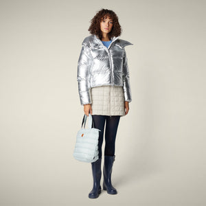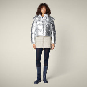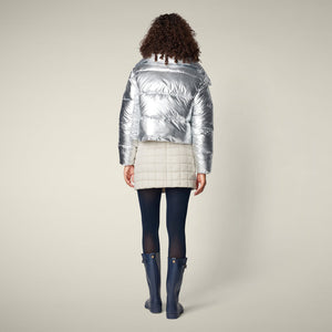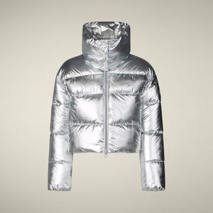 The Giselle model women’s puffer jacket stands out with its cropped cut and high-shine silver finish. It features a double collar with a snap-button panel that can be worn up for added protection or folded down for a relaxed look. The adjustable hem and elastic cuffs ensure comfort, while the tonal round logo and custom zipper pulls complete the design with signature details.