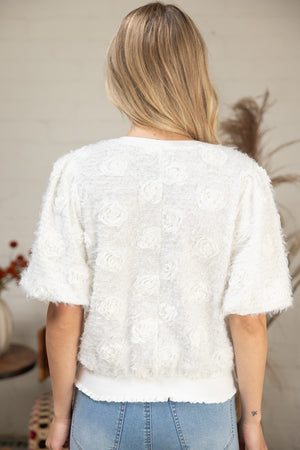 Meet DEON The Hadley Top — a sculptural statement piece that redefines elevated everyday wear. Crafted in metallic soft fur fabric, this top catches the light with a luxurious glow while its intricate 3D textured flowers invite a closer look. From the rounded neckline to the playful short bubble sleeves, The Hadley blends romance with modern polish for a look that’s unmistakably DEON.