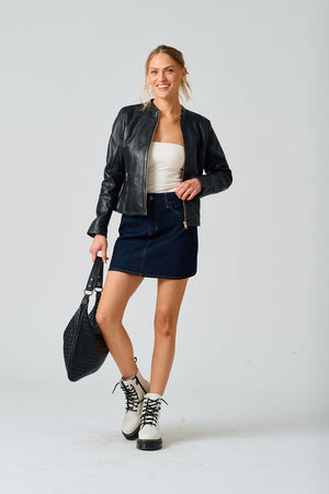 The Katharina Leather Jacket features a sleek silhouette in premium leather, finished with polished gold hardware for an elevated touch. A versatile staple that moves effortlessly from day to night.