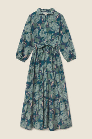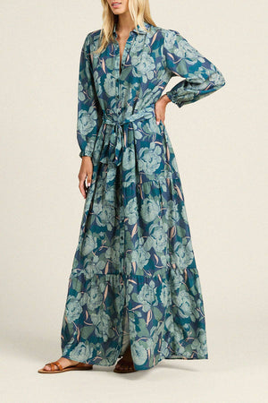 Our Martina dress is long and flowing, reaching the ground. Long pleats from the waist give extra movement to the tiered skirt. Completed with antique white buttons and matching self-fabric sash. Shown here in Hushed Shadow. Made from our cotton silk.