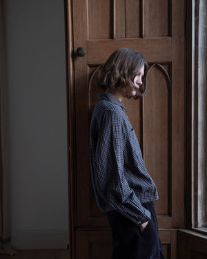 This boxy, cropped shirt is made in a soft, double-gauze cotton check. Its versatile shape means it can be worn alone or as an overshirt. Durable and timeless, this is Snow’s take on a collared shirt. It pairs well with trousers or a skirt. An easy-to-wear shirt that you can wear all year. Back yoke with full gather for shape. Full sleeves with buttoned cuffs. Contrast imitation shell buttons—two large front pockets.