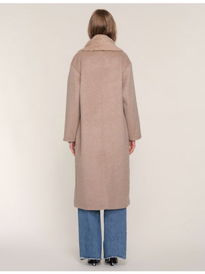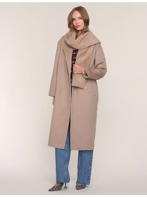 Introducing a super cozy coat, the Mate Coat. Made from a soft boucle, it has a relaxed, chic fit. It features a detachable faux shearling scarf. This is the ultimate way of looking cool but feeling cozy.