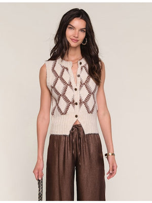 The Mina Vest is a relaxed fit, sweater vest. It features a crew neck, solid rib edges and a fun, diamond pattern.